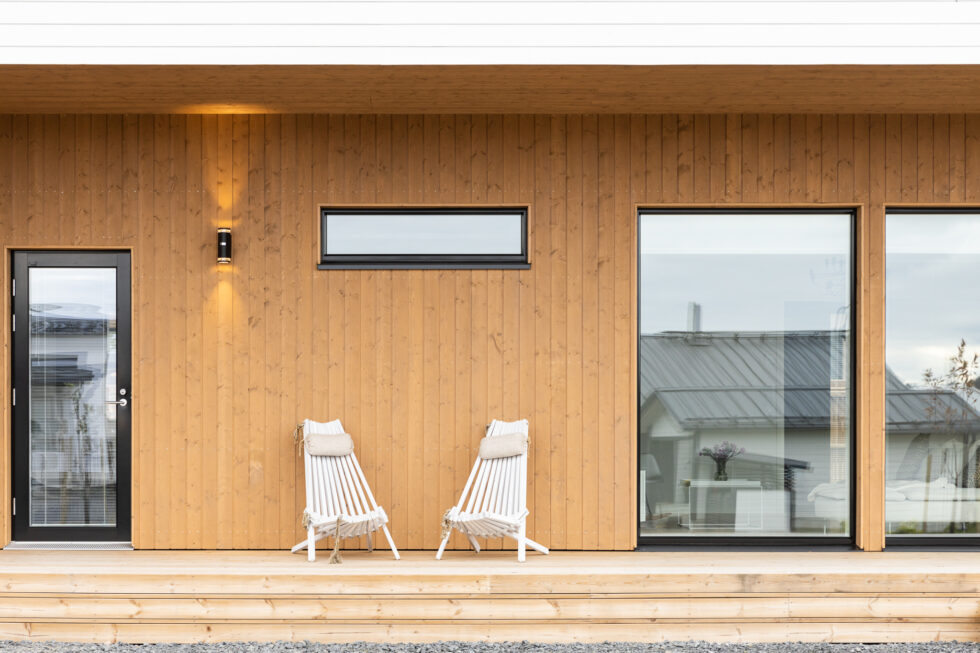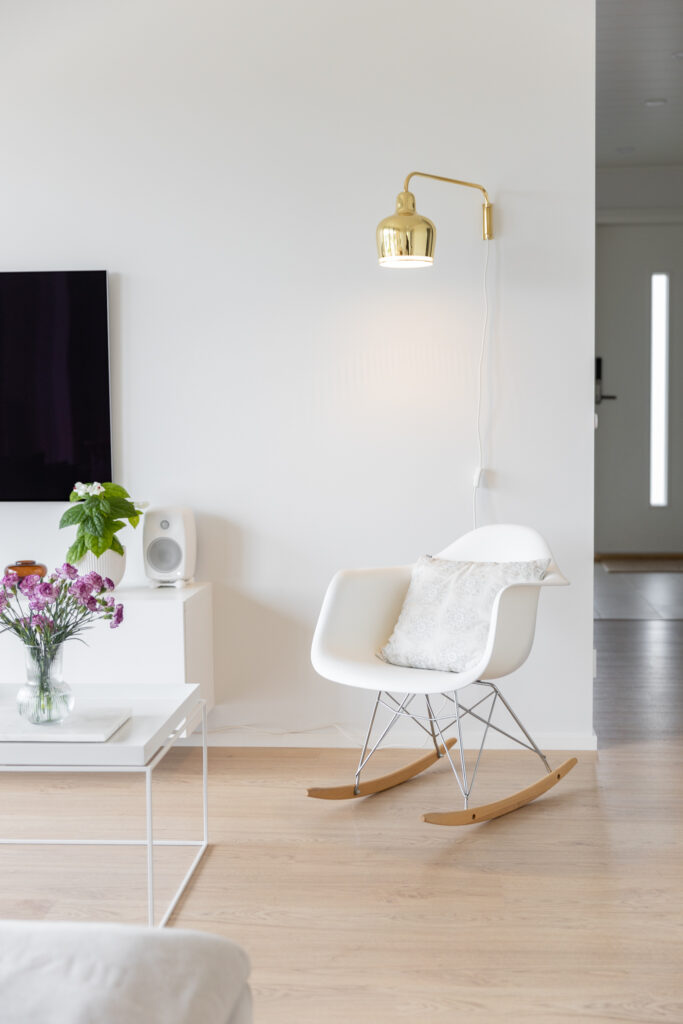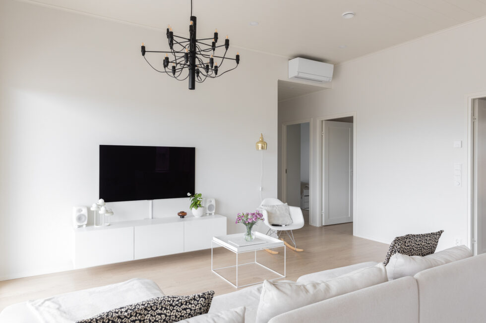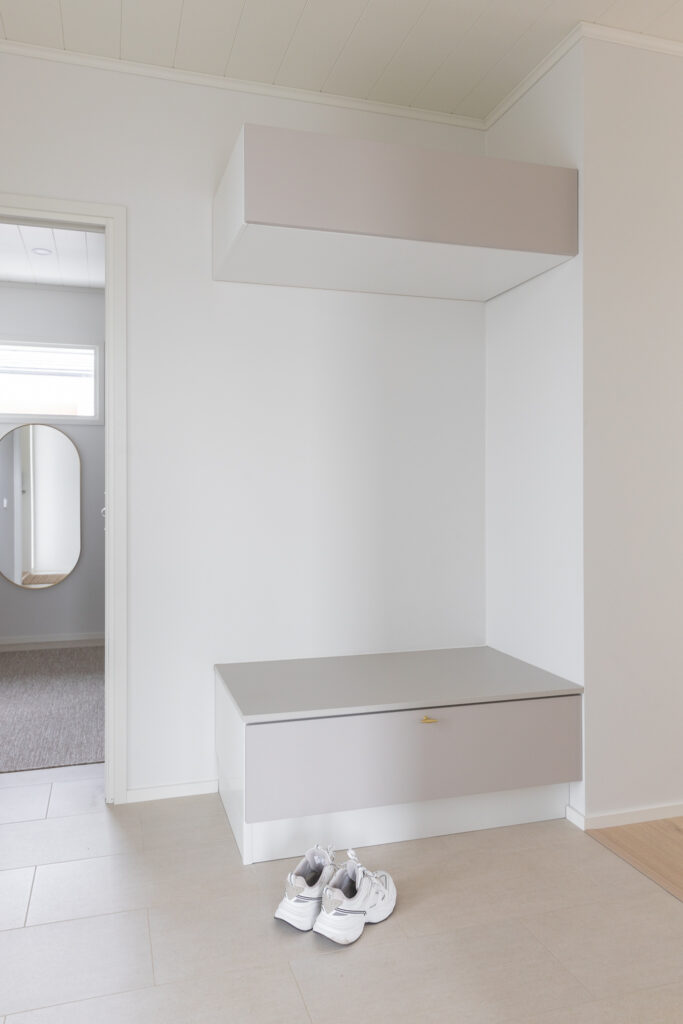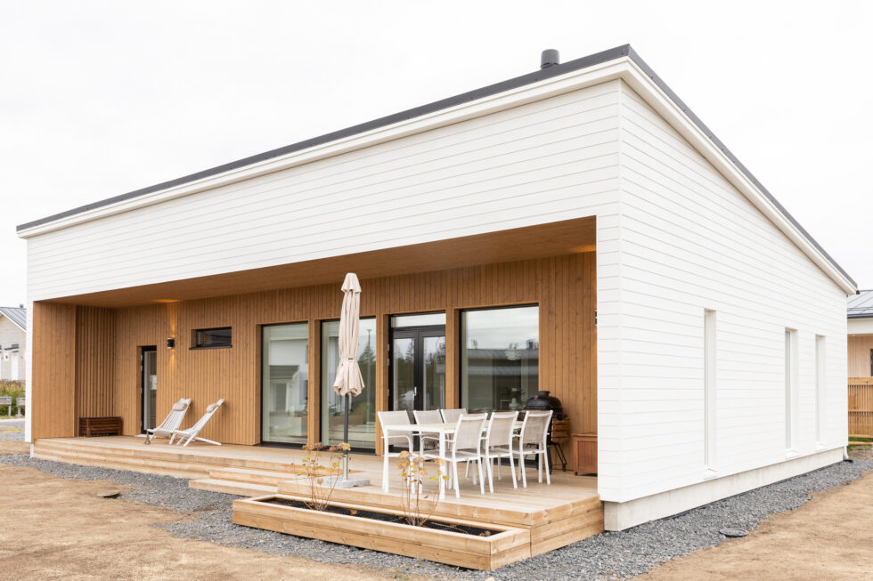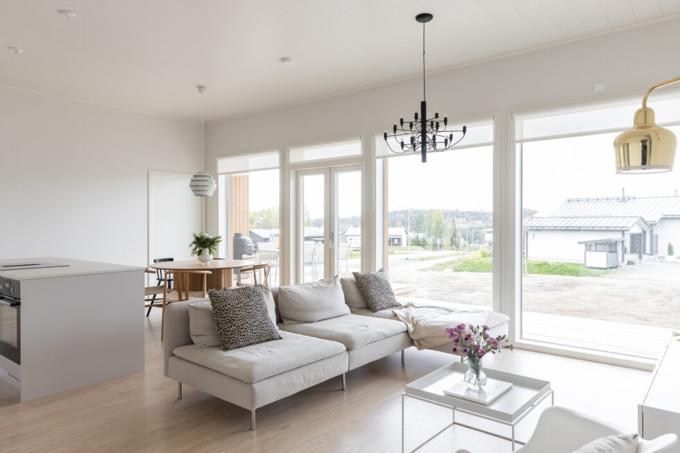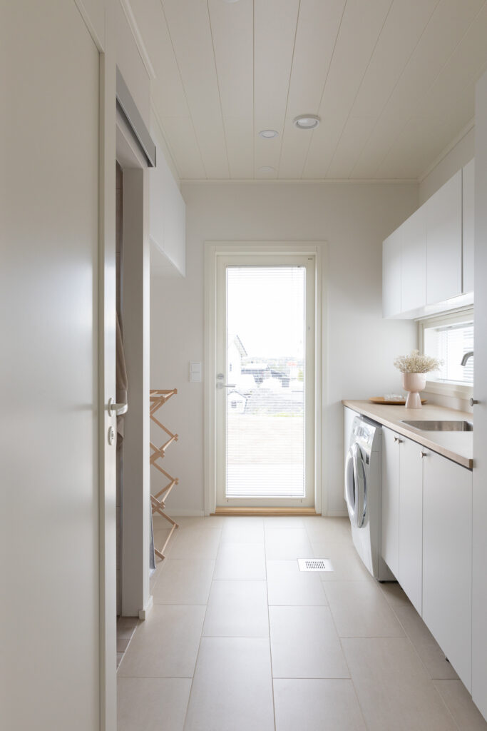 Tähän ihastuttavaan kotiin on sisällytetty kaikki tärkeät arjen ominaisuudet ja jopa neljä makuuhuonetta. Keittiössä on saareke, rauhallinen sävymaailma ja paljon valoisaa tilaa suurien ikkunoiden ansiosta. Keittiö-olohuoneesta on myös suora yhteys kauniiden pariovien kautta koko talon levyiselle, katetulle terassille. Tässä kodissa harkittu sävymaailma säilyy läpi talon aina oleskelutiloista lastenhuoneisiin.