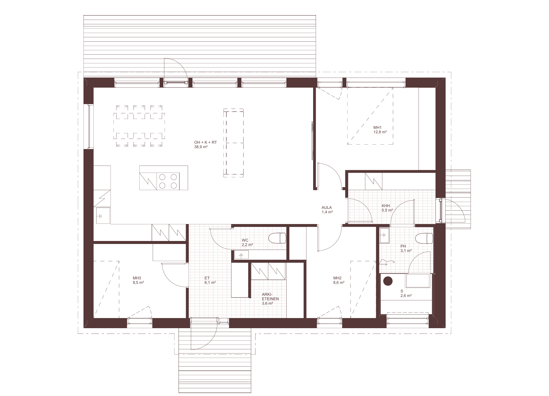 Kolme makuuhuonetta on sijoiteltu eri puolille taloa tarjoten yksityisyyttä. Kodinhoitohuone, kylpyhuone ja sauna on rauhoitettu omaan tilaansa makuuhuoneiden lähelle helpottaen esimerkiksi pyykkihuoltoa.