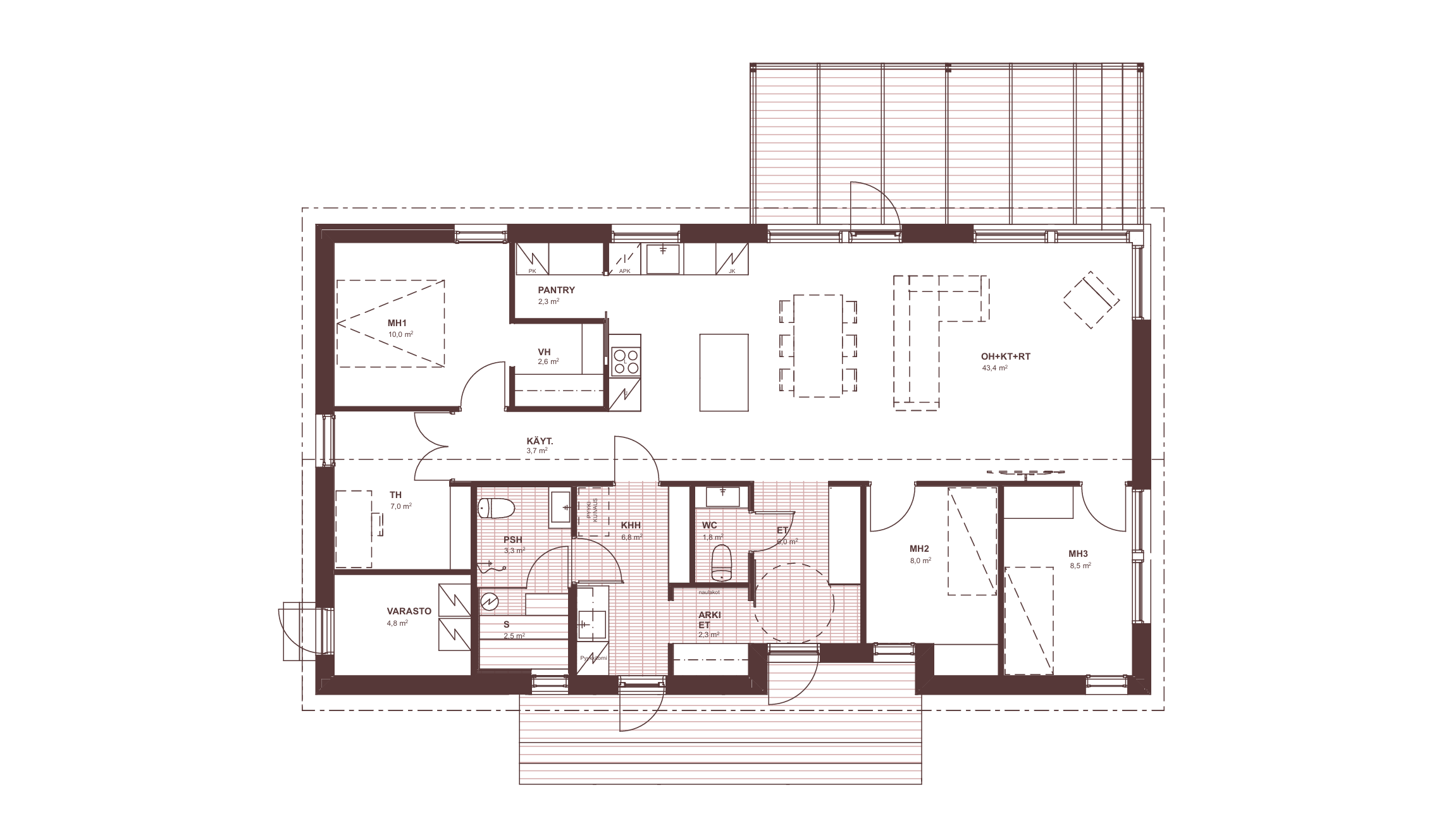 Linja 130 on kolmen makuuhuoneen koti, jossa on jätetty omaa tilaa myös työhuoneelle. Kodin suurimman makuuhuoneen yhteydestä löytyy lähes 3 m² vaatehuone. Kaksi pienempää makuuhuonetta on sijoitettu erilleen päämakuuhuoneesta, tarjoten yksityisyyttä.
