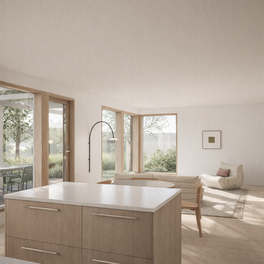 Kodin olohuone-keittiö on suurien ikkunoidensa vuoksi valoisa ja avara. Keittiössä arjen sujuvuutta lisää saareke ja liukuoven taakse kätkeytyvä ruokakomero. Saunatiloista on pääsy vilvoittelemaan etupihan terassille ja arkieteisestä on kulku kätevästi suoraan kodinhoitohuoneeseen.